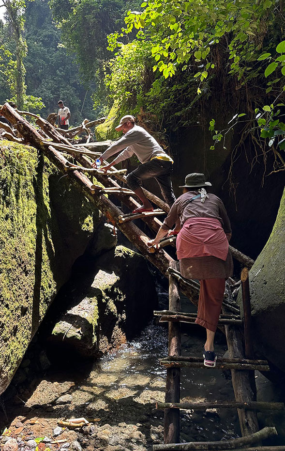 The trail winds through dense greenery typical of Mount Meru’s lower forest zone. Expect towering trees, thick ferns, moss-covered cliffs, vines, butterflies, and wildflowers. The air is cool, fresh, and scented with mountain vegetation.